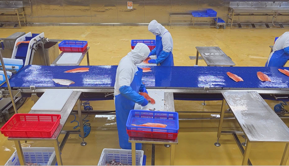 工人在生产线上处理三文鱼 图源:@尼勒克零距离