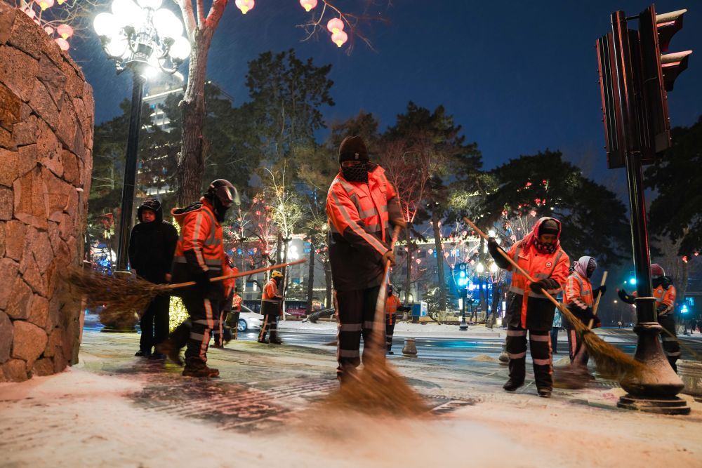 1月9日,长春市朝阳区环卫工人进行清雪作业。新华社记者 许畅 摄