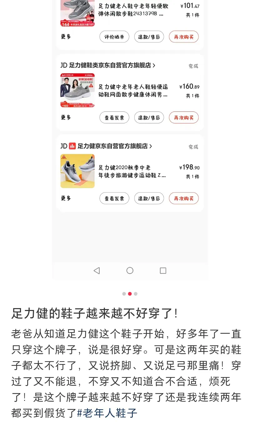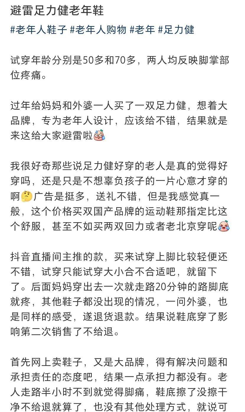 更让人唏嘘的是一位老顾客的经历:父亲多年来只认足力健,逢人就夸鞋子好穿,可这两年买的鞋却频频“掉链子”,要么脚挤得难受,要么足弓处压痛难忍,曾经的“忠粉”如今也成了“劝退”大军中的一员。