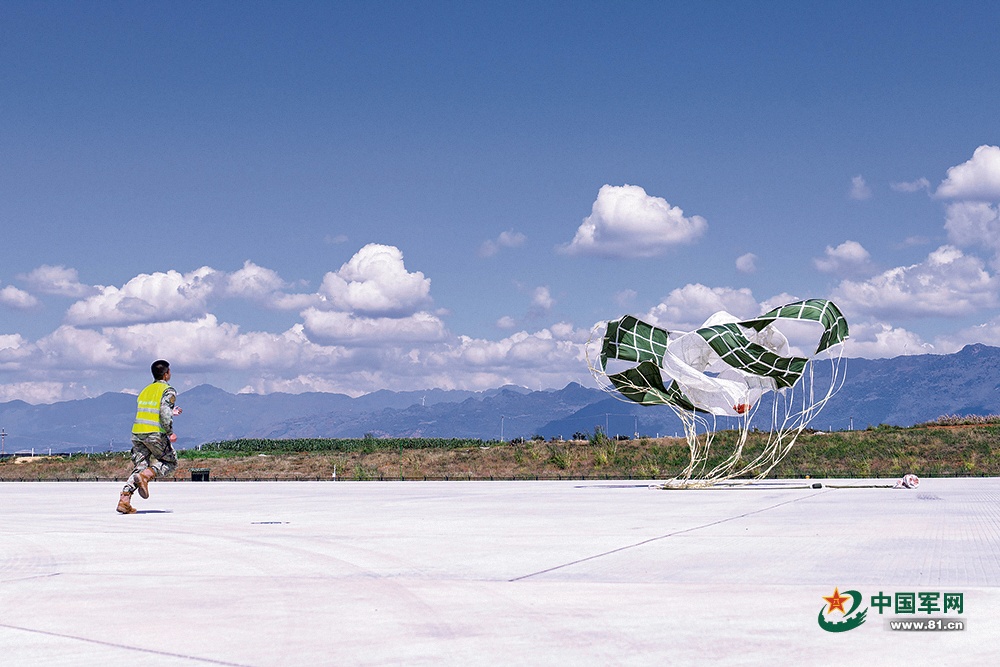 阻力伞脱落后,救生装具员快速跑去捡伞。