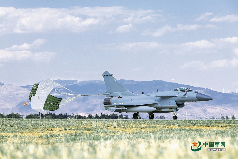 训练持续至正午,跑道上热浪蒸腾。战机返航,主轮触地滑跑,机尾伞舱“嘭”地弹出阻力伞,白绿相间的伞衣在气流中急速绽放,拖拽着疾速滑行的战机慢慢减速。