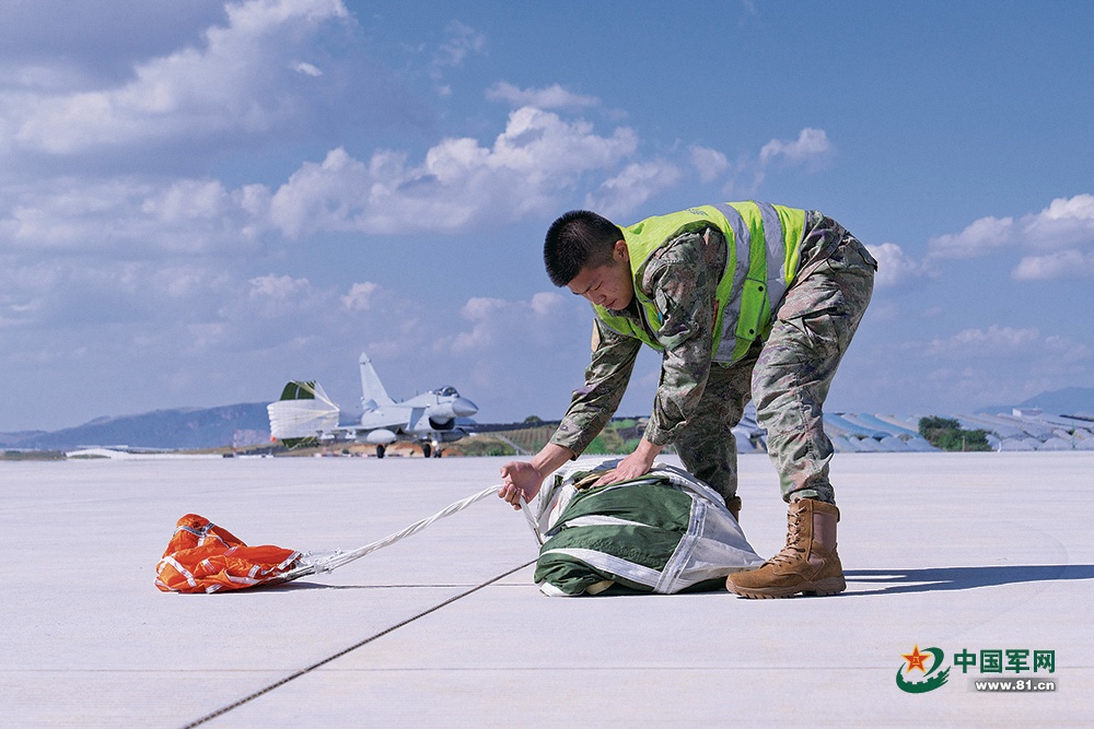 “伞具暴露越久风险越大,捡伞必须快、准、稳!”据介绍,阻力伞与战机脱离后,救生装具员需在十几秒时间内将伞具拖离跑道,并且利落地对伞具完成初步折叠,慢一秒都可能耽误后续战机起降,甚至引发险情。