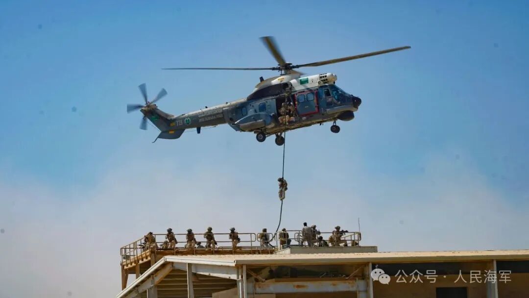▲中沙双方参训队员搭乘直升机实施空中突入