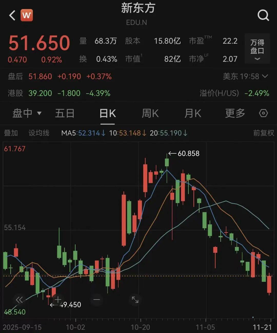 截至当地时间11月21号,美股新东方涨0.92%,报51.65美元,最新市值为82亿美元。