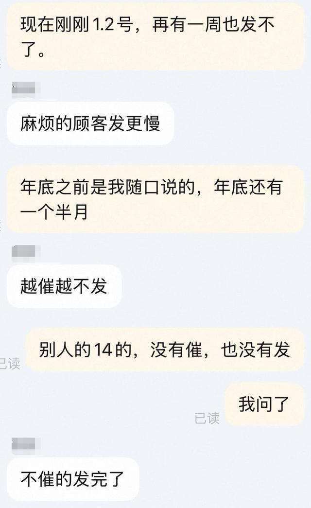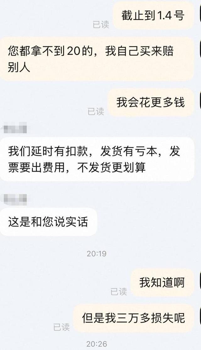 她向记者展示了与商家的聊天记录,对方起初以“缺货”“按订单顺序发货”等说辞搪塞,随着张女士的反复催促,商家的回复愈发强硬,甚至直言“越催越不发”“延时有扣款、发货有亏本、发票要出费用,不发货更划算”。