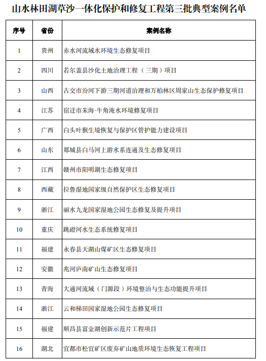 图为山水林田湖草沙一体化保护和修复工程第三批典型案例名单。图片来源:财政部