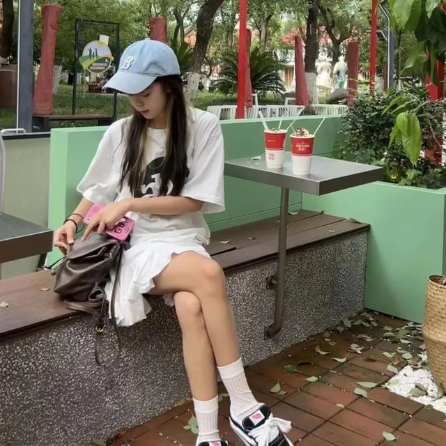 让朋友站高一点帮你去俯拍,脚尖对准镜头方向延伸,会显得你更瘦腿更长一点儿,有点摆拍的感觉,但不会妨碍你美腻~