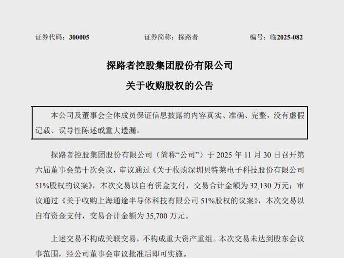 12月1日,探路者发布公告,宣布以自有资金合计6.78亿元收购两家半导体企业各51%股权,正式切入数模混合芯片、图像视频处理等核心领域。